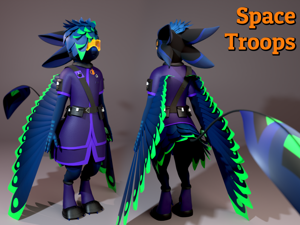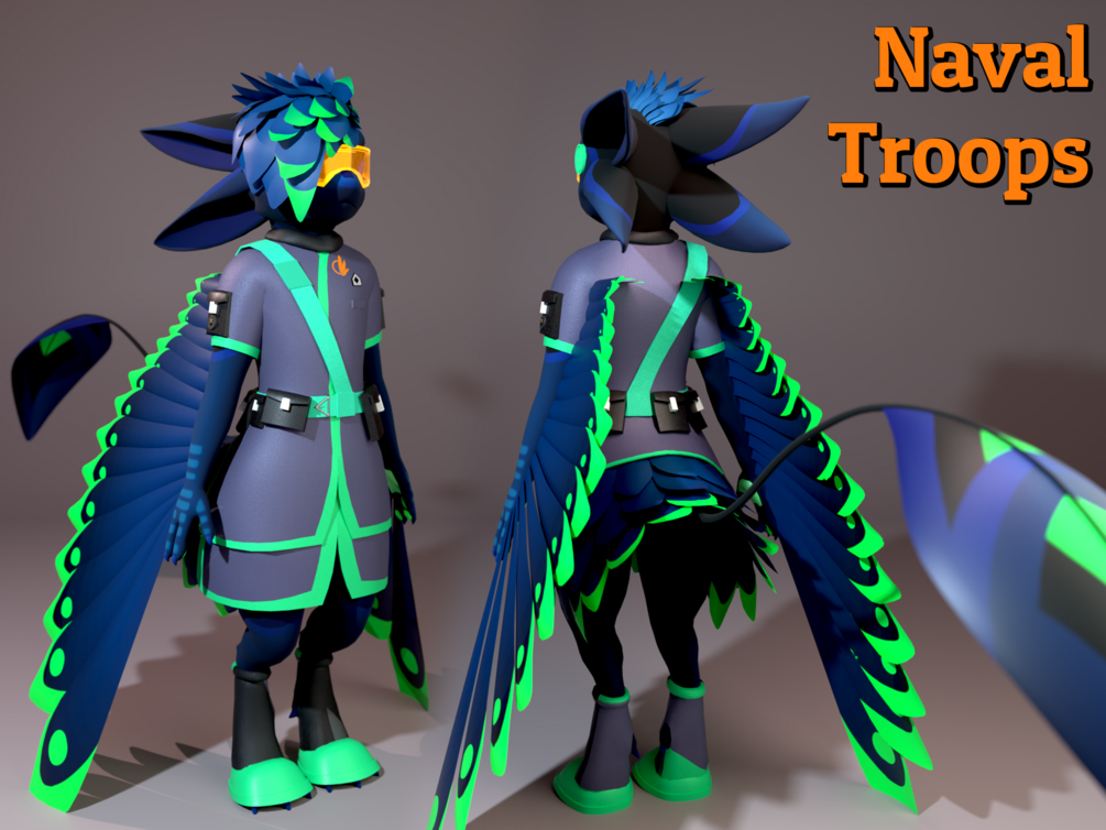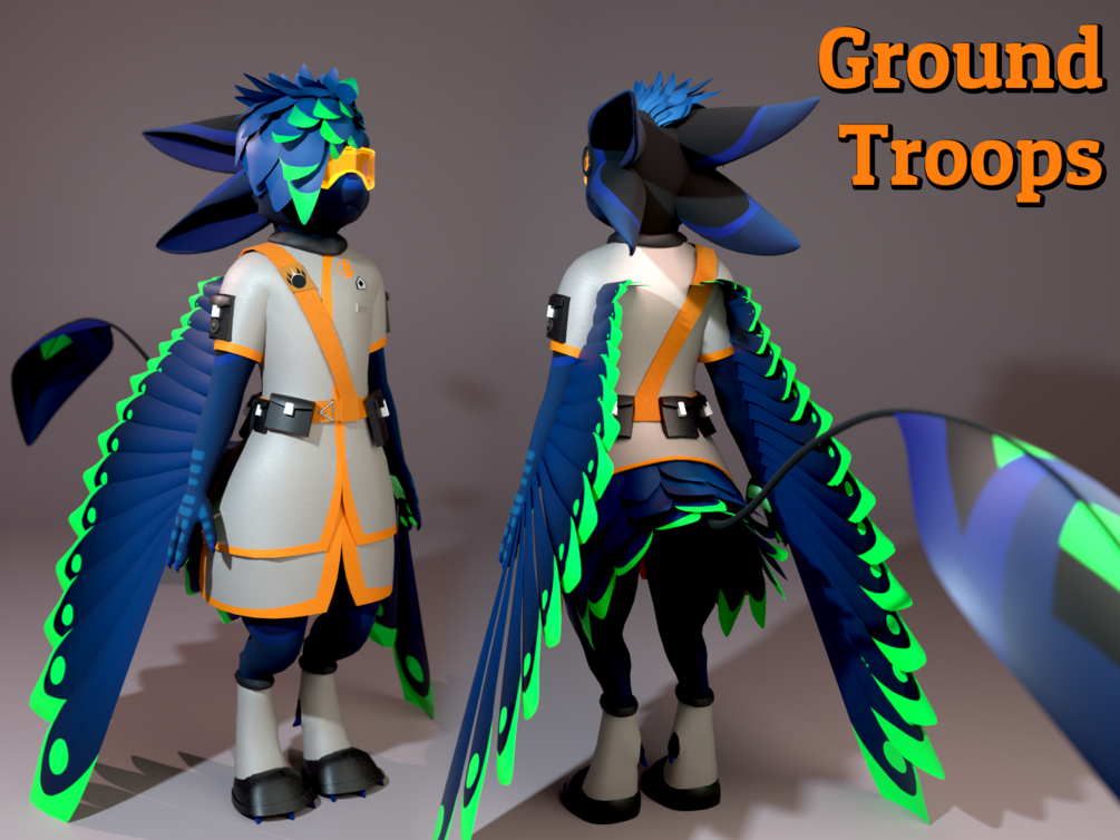 The uniform has standard color patterns in alignment with each military branch. Light gray with orange trim represent ground troops. Dark blue with green and light blue trim represent naval and air troops respectfully. Lastly, a purple outfit with a slightly brighter trim is used to denote space troops.
